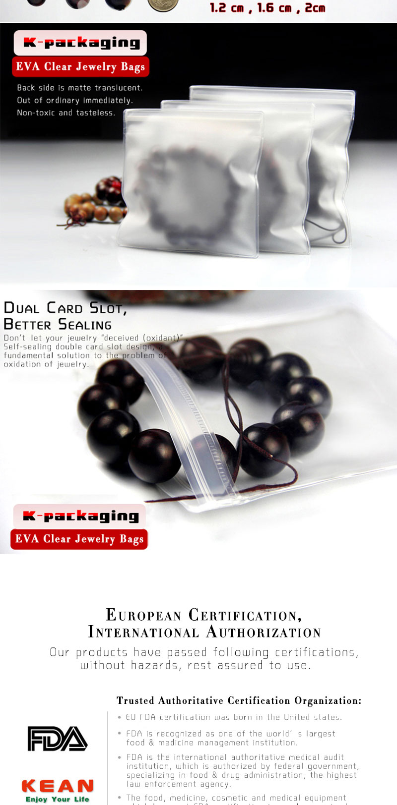 This bag can hold various jewelry, jadeite, button cell, pearl and small jade etc. Good performance on moisture-proof and anti-oxidant , can preserve the products inside for long term. |