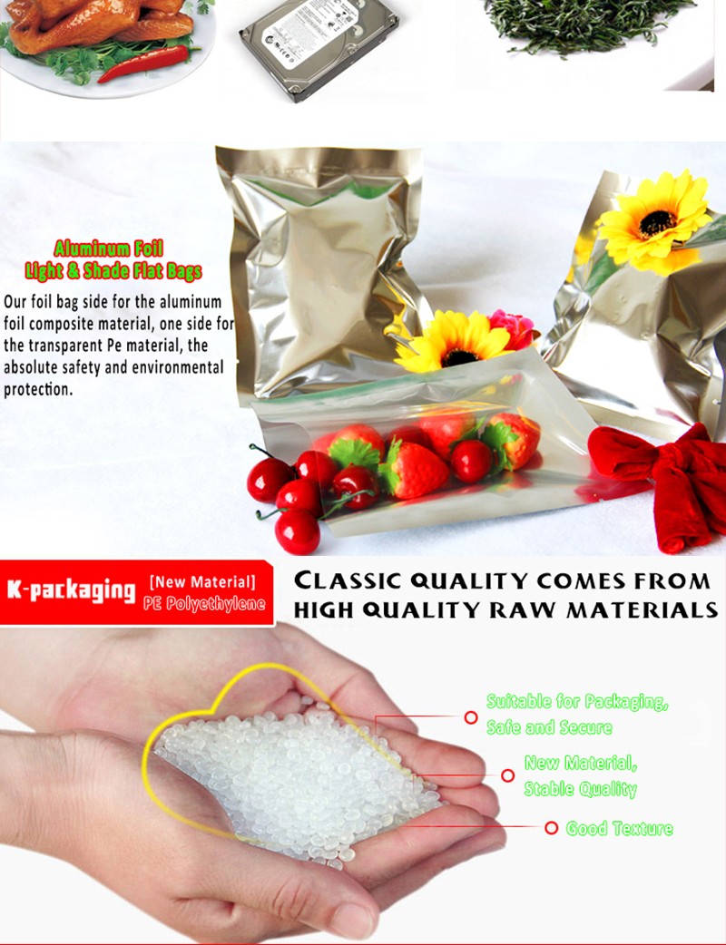 2) One side is clear and can show the products inside, while the other side is aluminum foil. High brightness aluminized material made the bag looks high quality. |