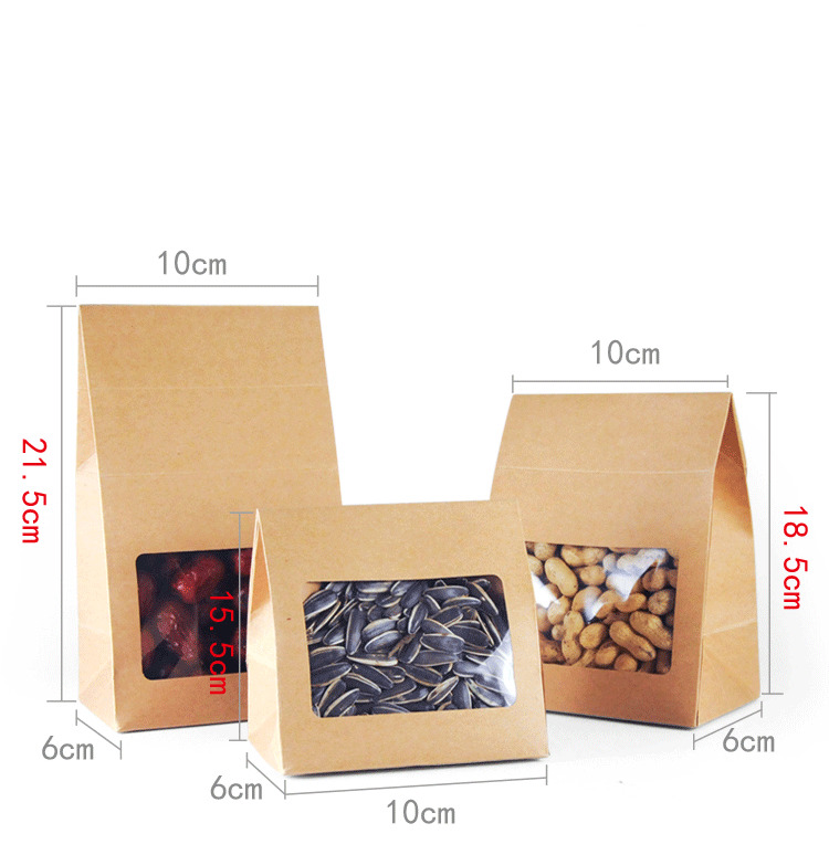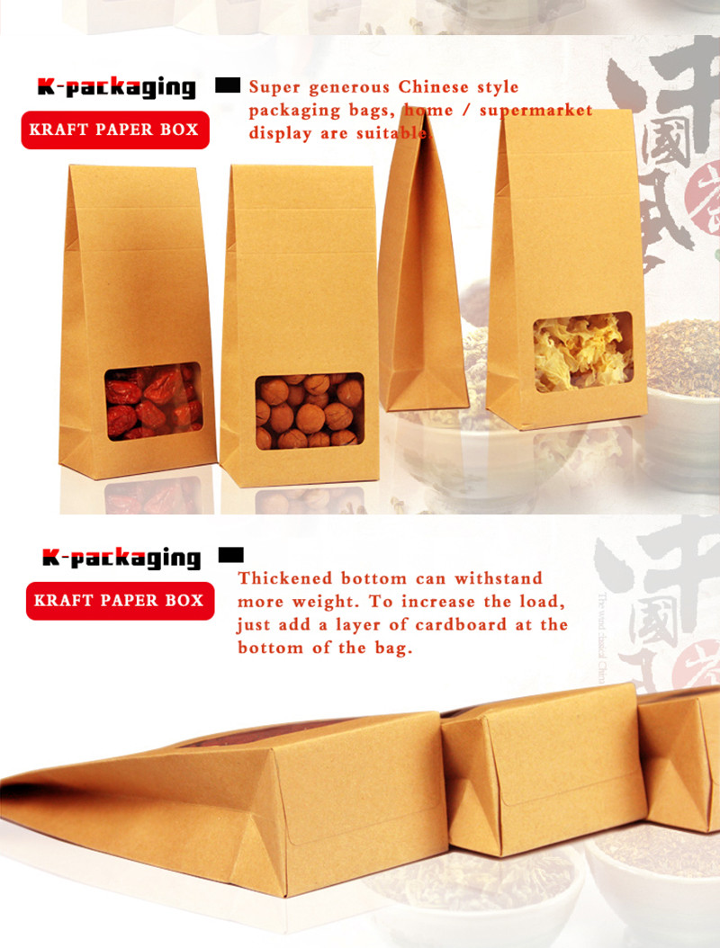 This product can hold various biscuits, cookies, cakes and nuts etc. Brown kraft paper makes the bag looks high quality and with upscale appearance. |