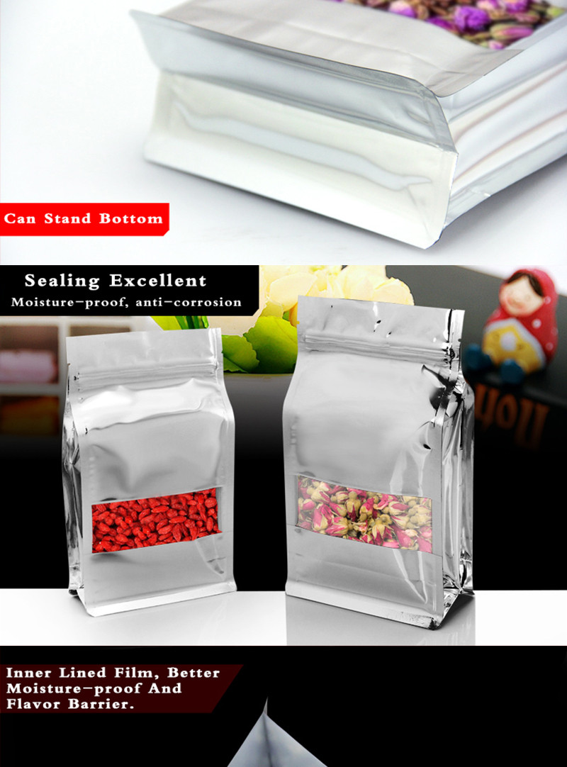 | Product Name | 5 pcs Quad Seal Flat Bottom Bags Foil Dry Food Packaging Ziplock Foil Bags with Clear Window |
